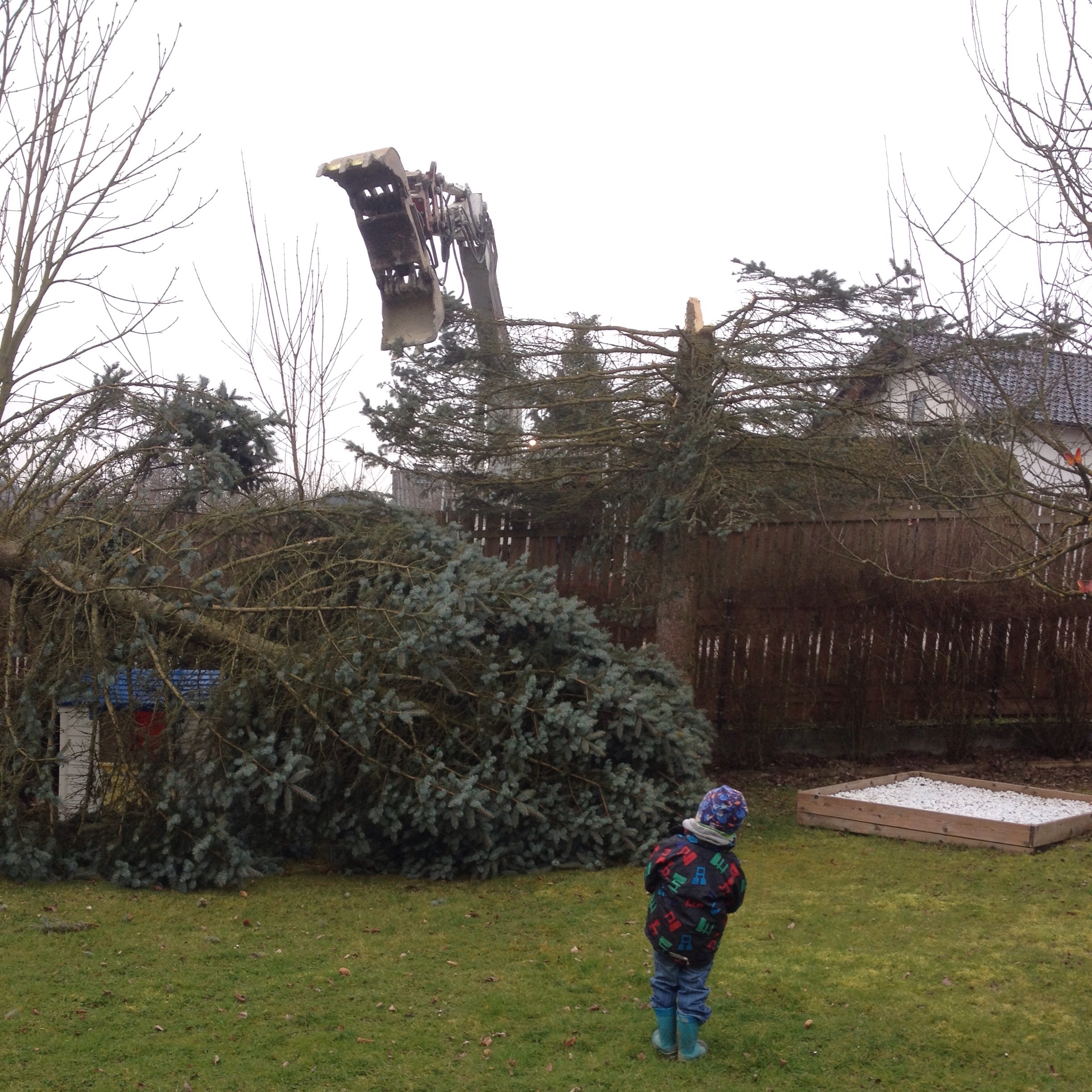 Als erstes schnappt der Bagger die Fichte und bricht die Krone ab. Die bleibt erstmal im Garten liegen und begräbt das hasenbubsche Haus unter sich.