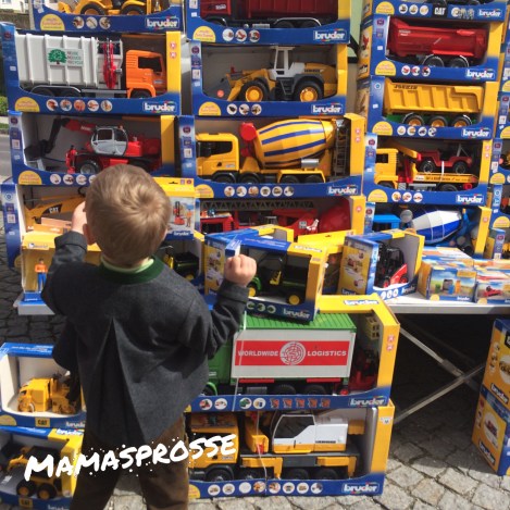 Auf dem Weg zum Eis (geht immer!) entdeckte der Hasenbub dann den „Himmel“. gefühlt das gesamte Bruder-Sortiment an einem Stand. Überflüssig zu erwähnen, dass wir nun um ein Fahrzeug reicher sind, oder? (Danke, Opa!)