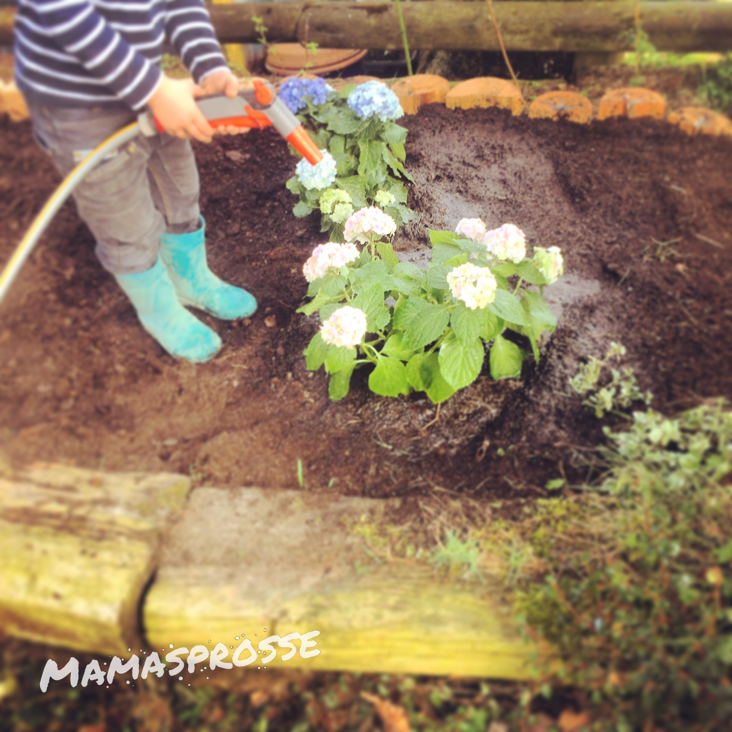 Ich arbeitete an meinem neuen Blumenbeet weiter. Selbst angelegt, selbst befüllt, doch „fremd“ gegossen. Sobald Wasser im Spiel ist, steht nämlich der Hasenbub auf der Matte. Das ist sein Element. Wehe dem, der den Schlauch ohne seine Erlaubnis benutzt.