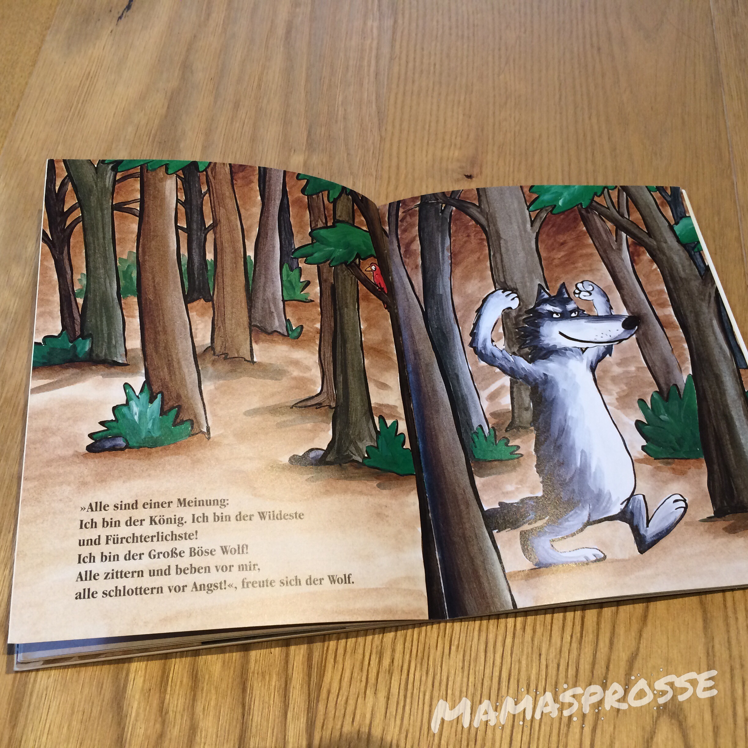 Die Geschichte dreht sich um einen eitlen starken Wolf, der einen Spaziergang durch seinen Heimatwald macht. Er will mal wieder hören, was denn im Wald so über ihn gesagt wird.