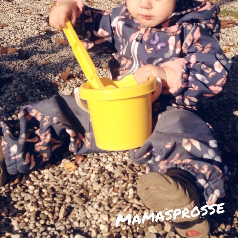 Am Spielplatz schaufelt meine kleine Babymaus später eifrigst Kieselsteine hin und her und muss eine ganz lange Zeit nicht trotzen. Weil die braven Kieselsteine auch alles machen, was sie will. Weiter so.