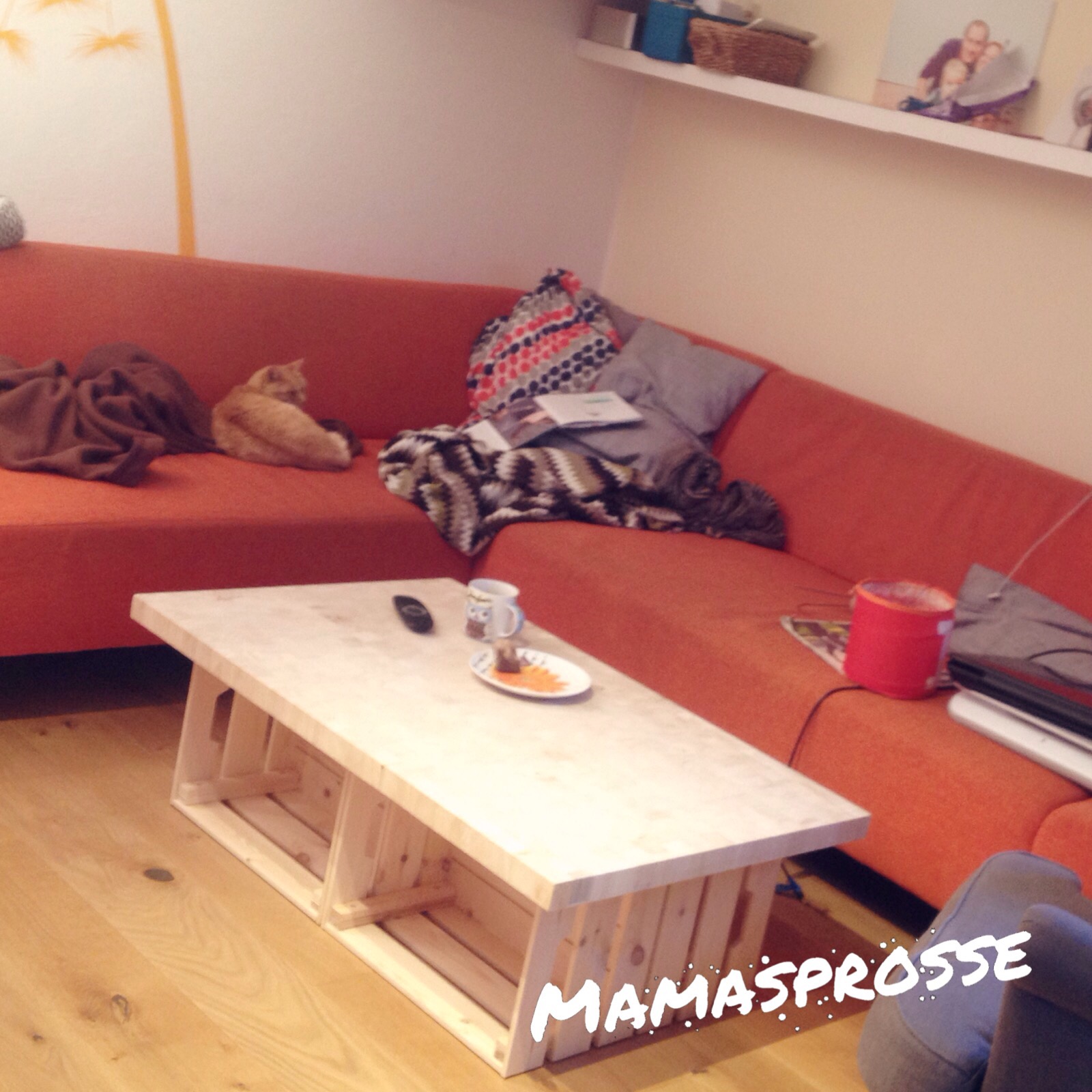 Unser alter Couchtisch ist einfach zu klein und muss somit weichen. Baba. Also startet ich mein DIY-Projekt und bin, 4 Kisten, eine Platte und 10 Schrauben später echt sehr zufrieden.